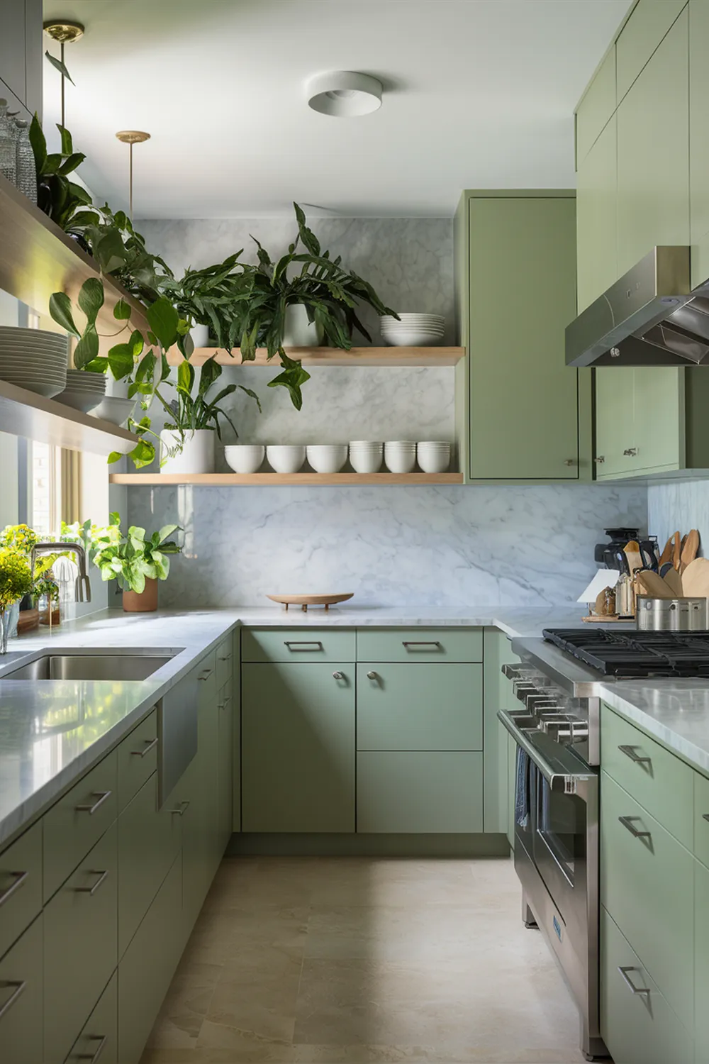 Sage green cabinets with open shelving offer a modern twist for a bright, welcoming kitchen. Light wood shelving not only brings warmth but also provides a functional space for displaying your favorite dishes or potted herbs.