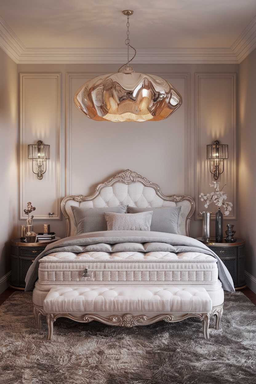 A bold pendant or chandelier draws the eye upward, adding a sense of height and style to small bedrooms.