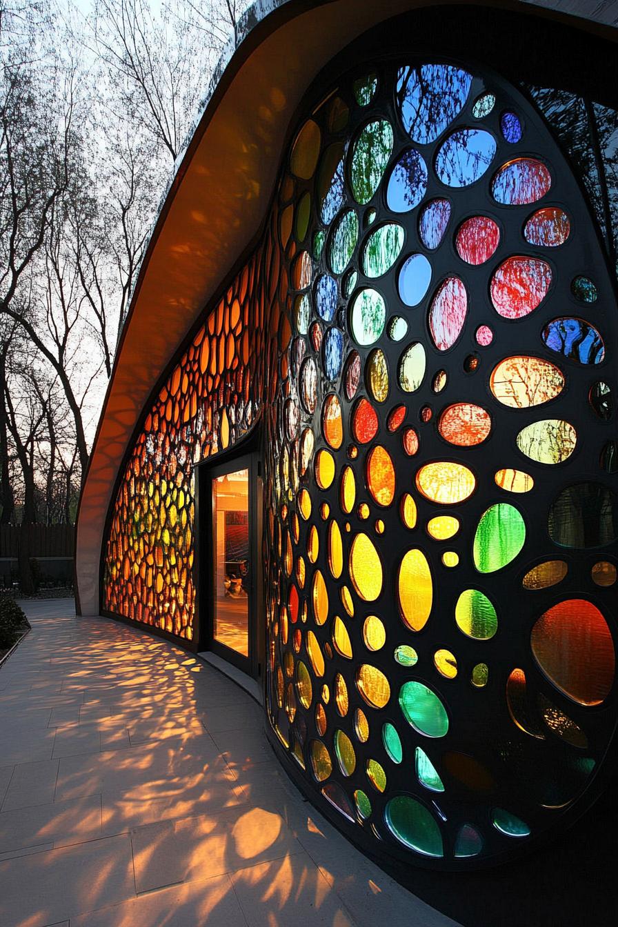 This house sports a stunning facade covered in multi-hued, oval-shaped glass panels that resemble something out of a techno-colored dream. The playful light bouncing off those vibrant windows must feel like living inside a rainbow!