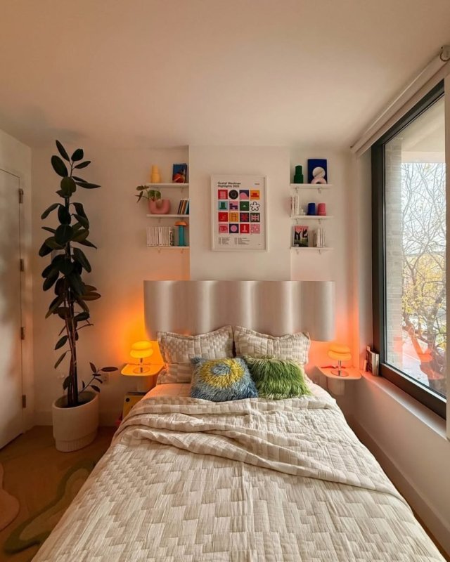 Add a textured headboard in a light color to create a clean backdrop. Pair this with bright throw pillows that introduce color and fun. Consider placing a tall indoor plant nearby for a fresh, lively touch. This combination brings life and an artistic vibe to your space.