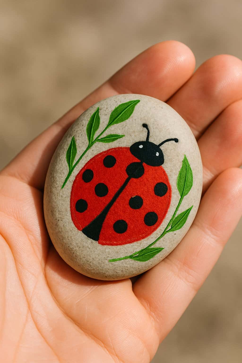 This delightful design features a bright red ladybug, cozied up among painted green leafy sprigs on a smooth stone. It’s a fresh and fun idea that brings a little garden magic right into the palm of your hand!