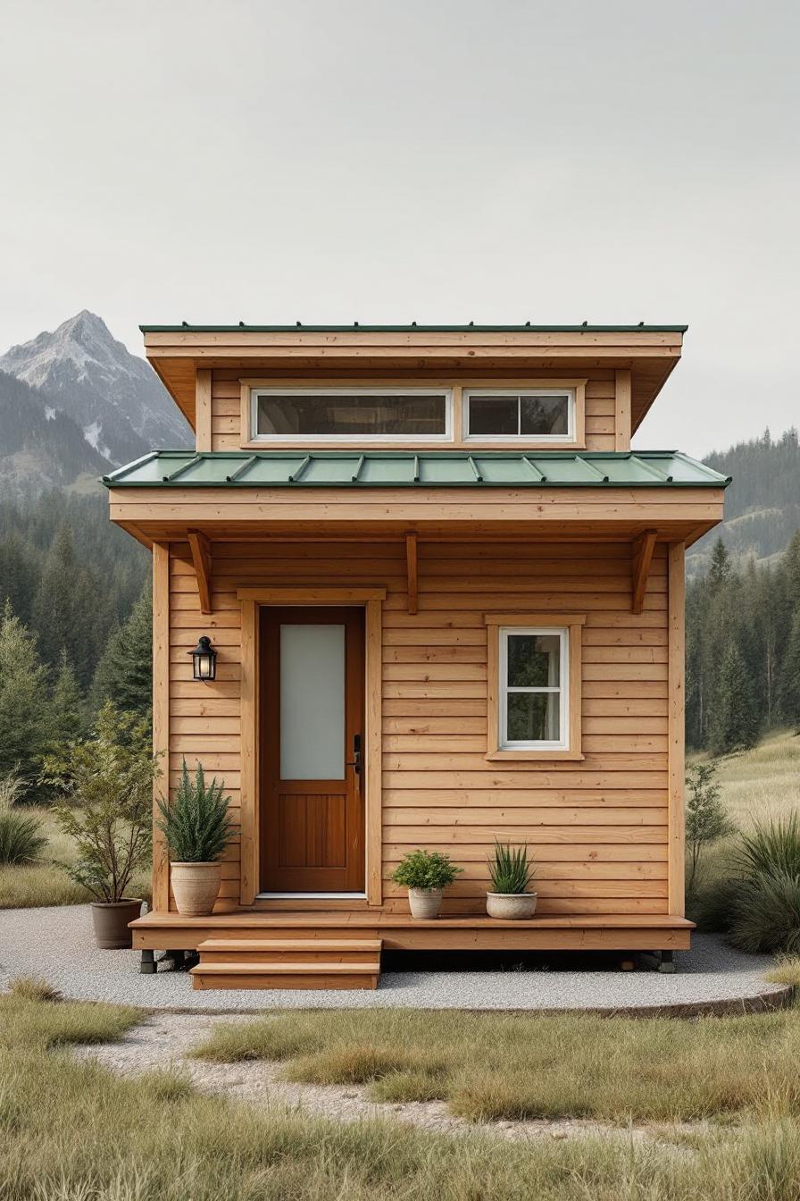 Say “hello” to this delightful wooden micro house, snugly nestled in an open meadow with majestic mountains photobombing in the background. This charming abode boasts a smooth wooden finish, accented with a green metal roof, blending effortlessly with the surrounding nature.
