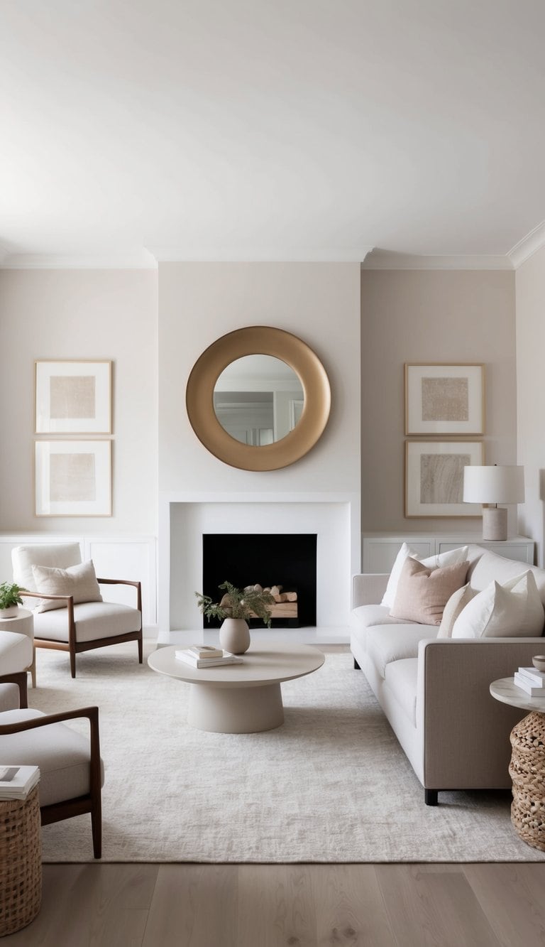 A sleek, round coffee table anchors the space, echoing the room’s soft, neutral tones. Layered textures, subtle decor, and flowing curtains enhance the serene, minimalist ambiance.