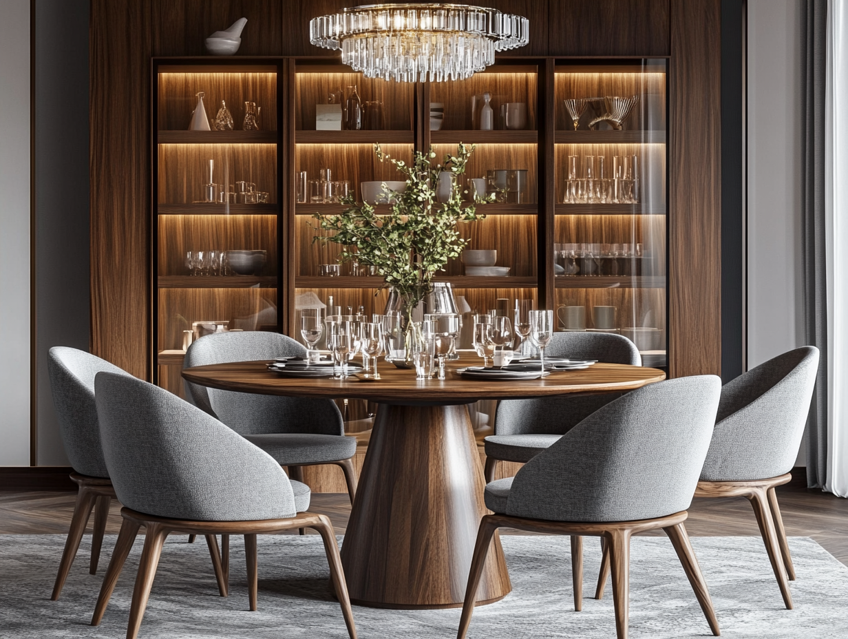 Transform your dining space into a stylish haven with this beautiful mid-century modern dining room set 🍽️. Featuring a warm circular walnut dining table and comfortable gray dining chairs, this setup invites friends and family to gather and enjoy meals together 🪑. Enhance the ambiance with elegant dining room lighting, like a stunning chandelier, and incorporate decorative elements on open shelving for a cozy, inviting atmosphere. Explore unique decor inspirations and design tips for a modern dining room that reflects your personal style ✨.