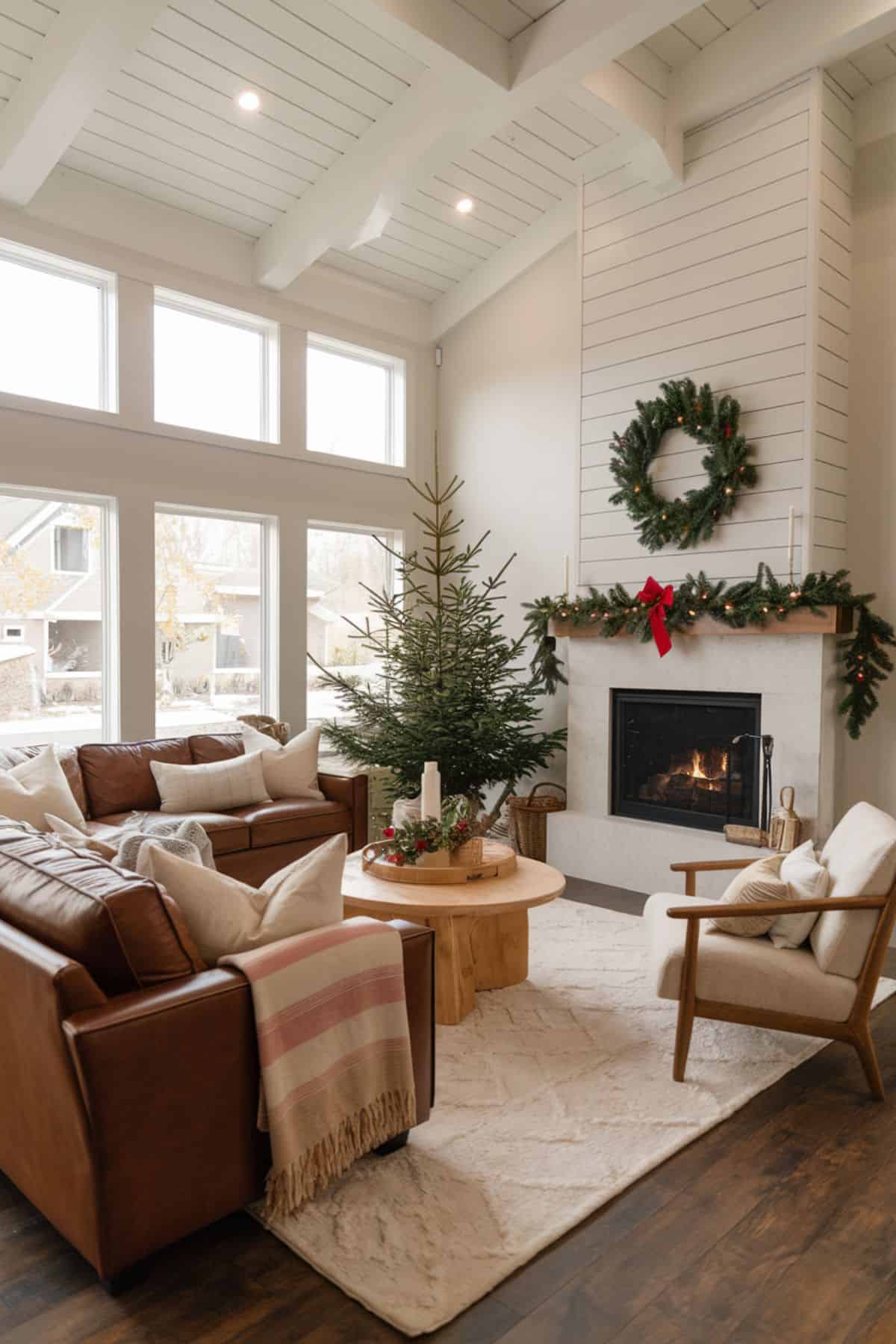 Keep it neutral and cozy with beige and cream tones, accented by a natural pine garland and a wooden tray filled with candles and pinecones. It’s simple, elegant, and festive.