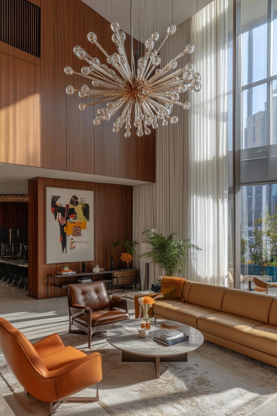 Welcome to a living room where a starburst chandelier has decided it’s showtime! This mid-century marvel flaunts a comfy caramel sofa that whispers of endless relaxation.