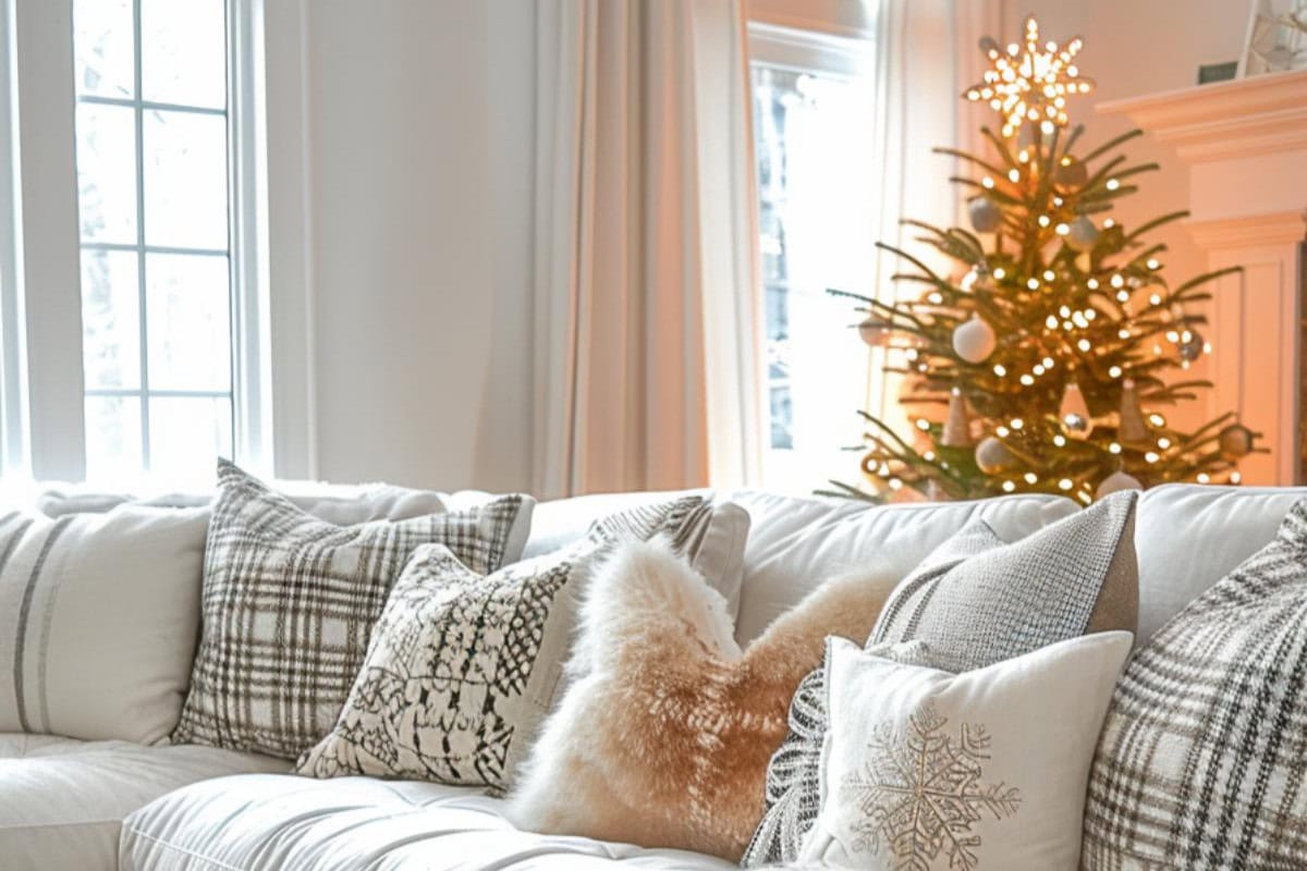 Enjoy the playful yet subdued patterns of pretty neutral-colored holiday pillows scattered nonchalantly across the living room. They blend seamlessly into the muted decor of the space.