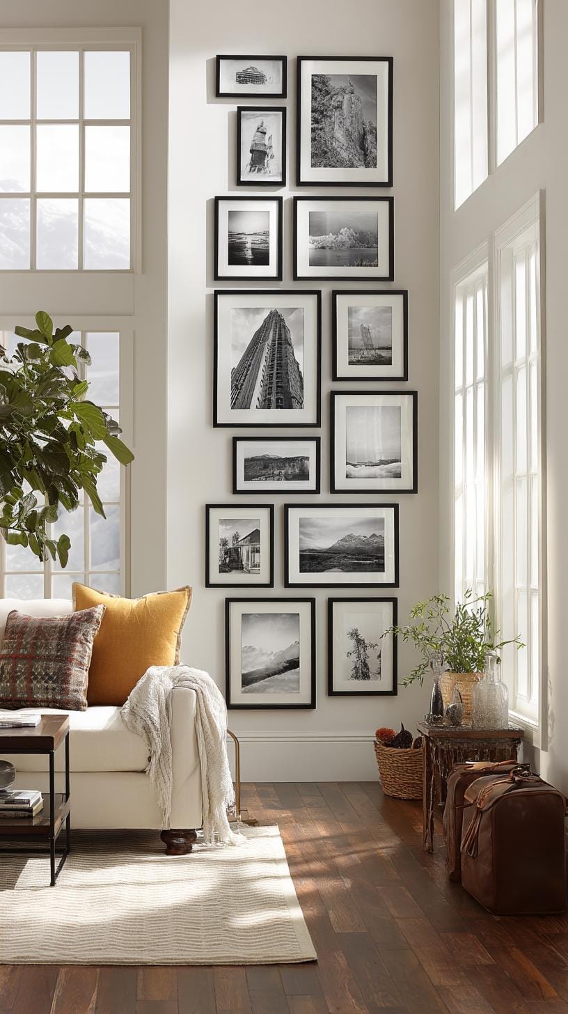 Consider a vertical photo column stretching from floor to ceiling. This layout works brilliantly in tight spaces such as hallways or beside doors. It draws the eye upward, making ceilings seem taller.