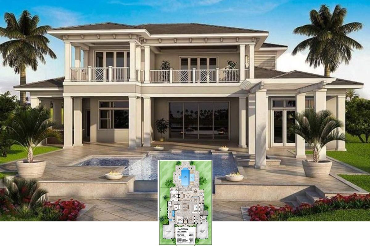 Commanding attention with its symmetrical façade, this two-story tropical-style home embodies elegance with large windows that invite natural light indoors. Tall columns add grandeur and support to the covered balcony, creating an outdoor space that seamlessly integrates with the upper-level living areas. In the foreground, a swimming pool beckons for leisure, its tiled patio framing the watery reflection while potted plants and manicured shrubs inject bursts of greenery into the scene. The presence of two strategically placed palm trees enhances the tropical atmosphere, standing sentinel against the backdrop of a pristine blue sky.