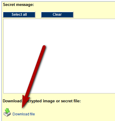 To decrypt a message, either upload it or enter a URL (which means you can share links to a secret message as well as send the actual file), enter the password, and click on “Decrypt”. Again, it may seem like nothing is happening, but scrolling down will reveal the message either in the Secret message box, or, if you chose to hide the message in a file, it will be available for download using the same Download file link seen above.