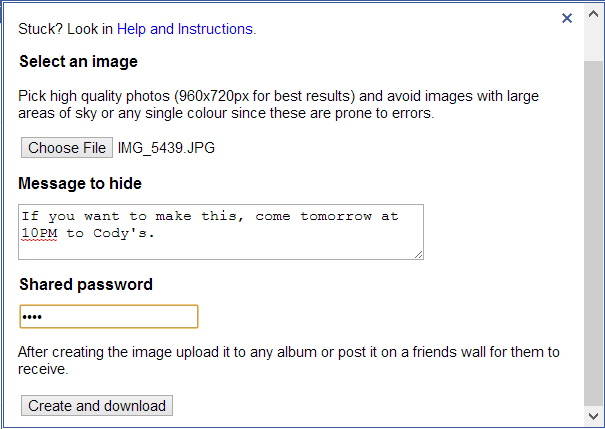 You can then download the file and upload it to Facebook. To decipher the message, press ctrl+alt+a while looking at the picture, and input the password. If the password is correct, the message will be displayed!