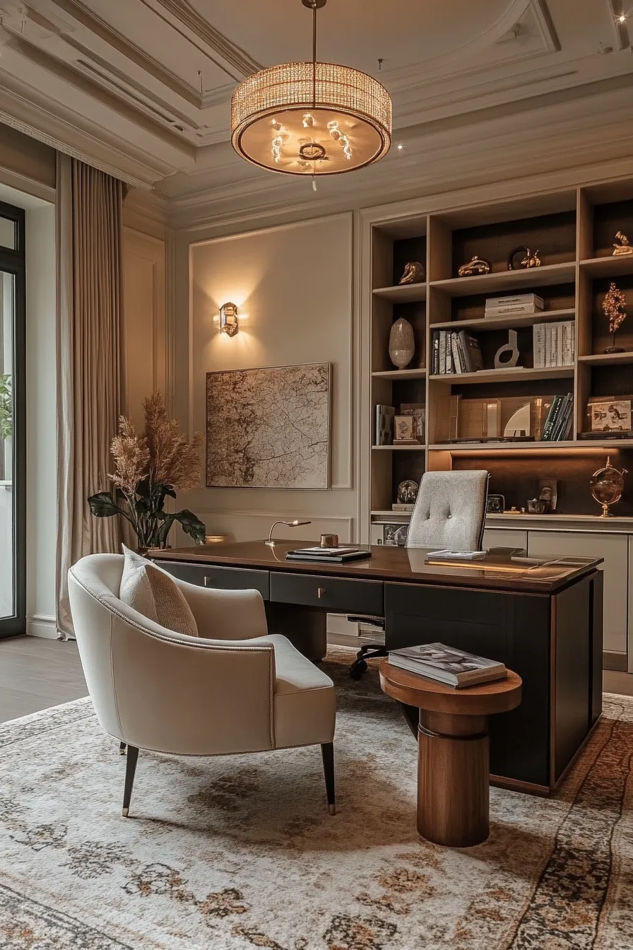 Mixing materials is key to creating depth and interest in your fall-inspired office. Combine smooth leather accents with rough-hewn wood elements, or pair sleek metal finishes with natural woven baskets. Don’t forget to introduce seasonal touches like velvet curtains or a faux fur seat cushion to truly embrace the autumnal vibe.