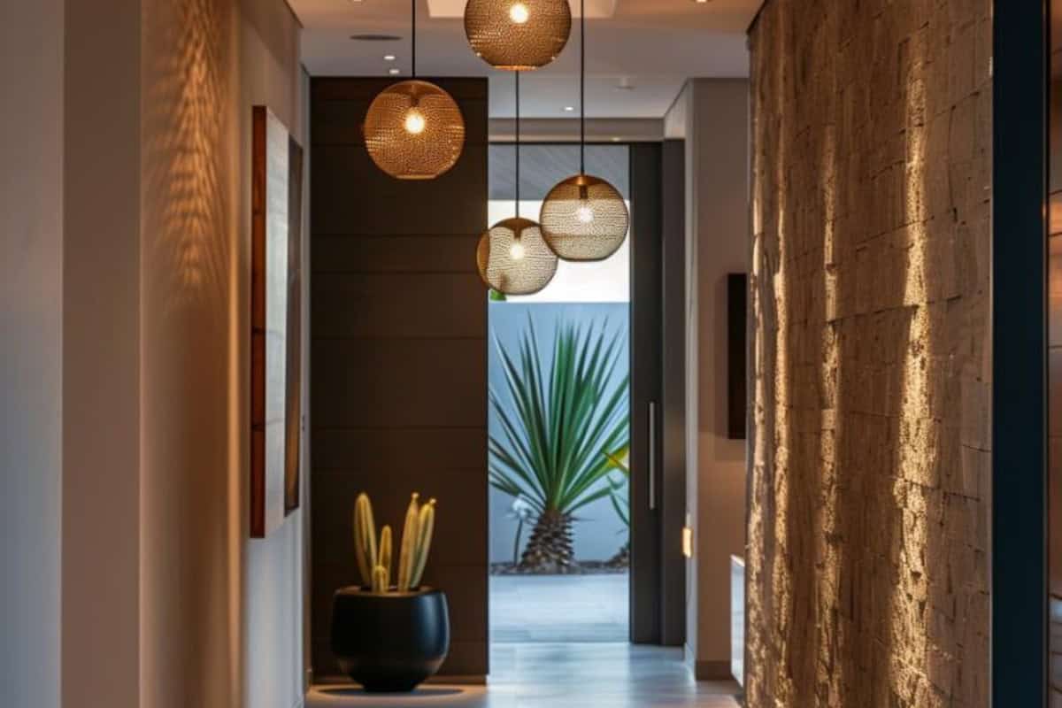 If your entryway is too small for too much furniture and decor, try this. Hang eye-catching lighting from the ceiling, casting a warm glow and lifting the ambiance of the space. Also, try a stone accent wall on one side and wood on another, then complete the space with indoor plants in the corners.