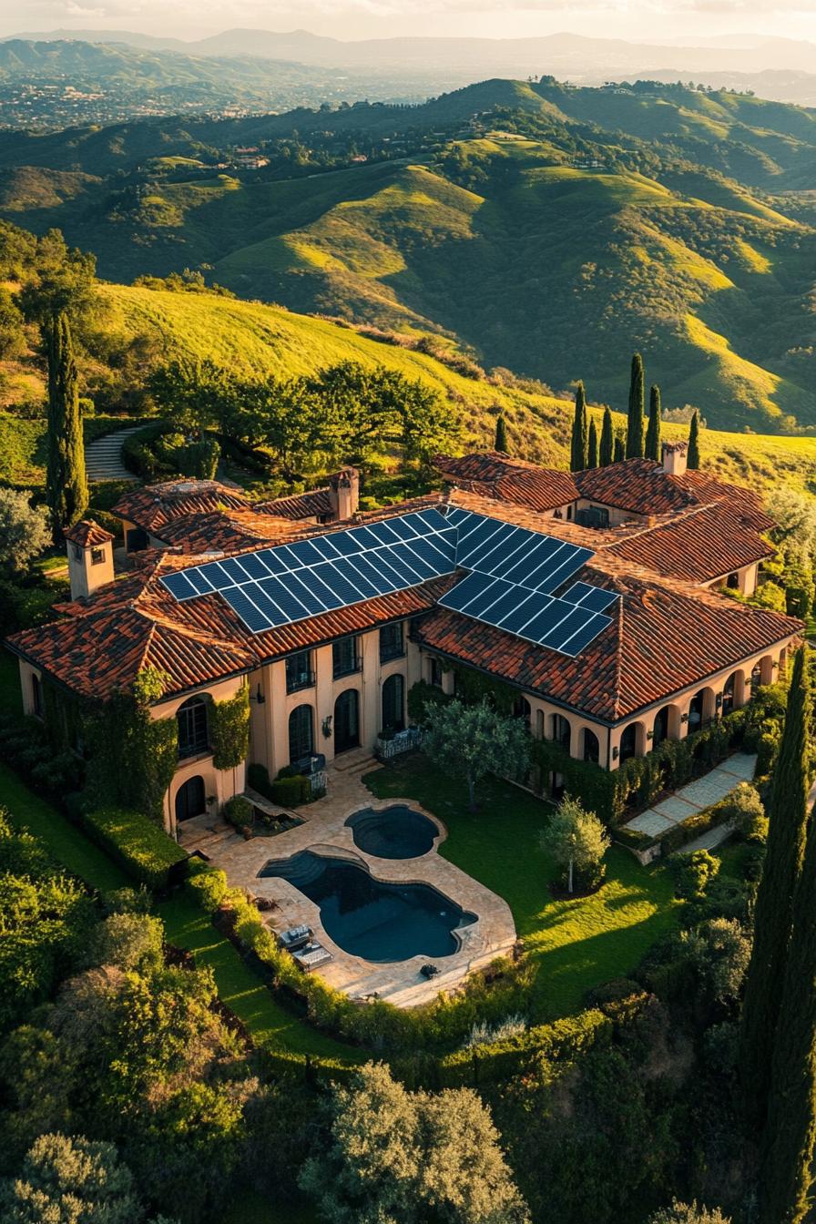 luxury hillside manor mansion with solar panel roofs overlooking picturesque green hilly fieldsluxury hillside manor mansion with solar panel roofs overlooking picturesque green hilly fields