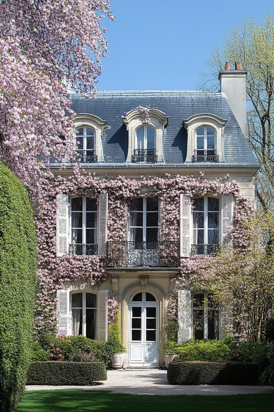 This charming French mansion, draped in delicate pink blossoms, stands proudly with its classic three-story facade. Amid the cascades of flora, the arched windows and intricate wrought-iron balconies on the upper levels wink at passersby like a well-dressed Parisian.