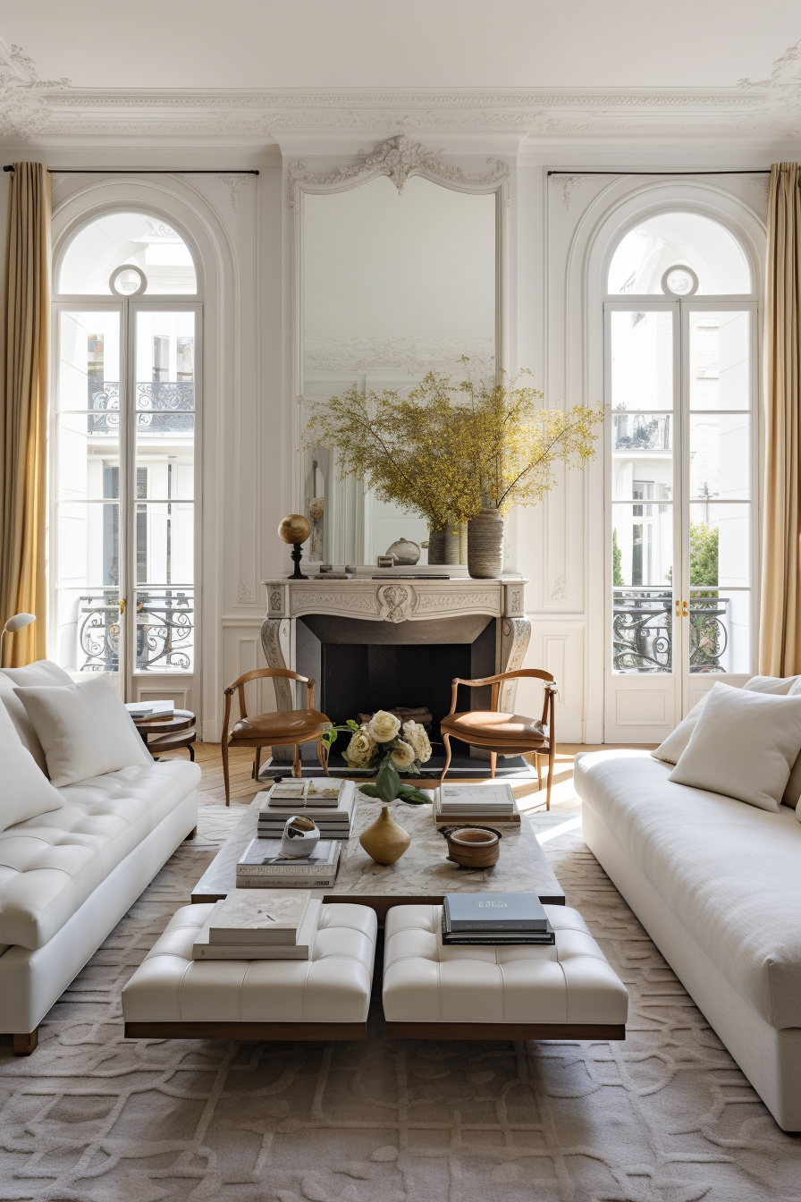 Imagine stepping into a chic, sophisticated French Parisian living room that exudes an air of timeless elegance and effortless style. The centerpiece of this stunning space is a beautiful, antique fireplace, its intricate, marble mantel adorned with an array of elegant, gilt framed mirrors and original artwork that reflects the soft, warm glow of the flickering candles. Surrounding the fireplace, you’ll find an array of luxurious, yet inviting seating options, from the plush, velvet sofa to the pair of graceful, bergère chairs, all arranged to encourage intimate conversation and relaxation, while the walls, adorned with exquisite, hand-painted boiserie and crowned with a magnificent, crystal chandelier, create an atmosphere of refined beauty and Parisian charm that invites you to sit back, relax, and savor the art of French living. To help you on your journey here are 41 unique elements that typically form the French living room aesthetic.