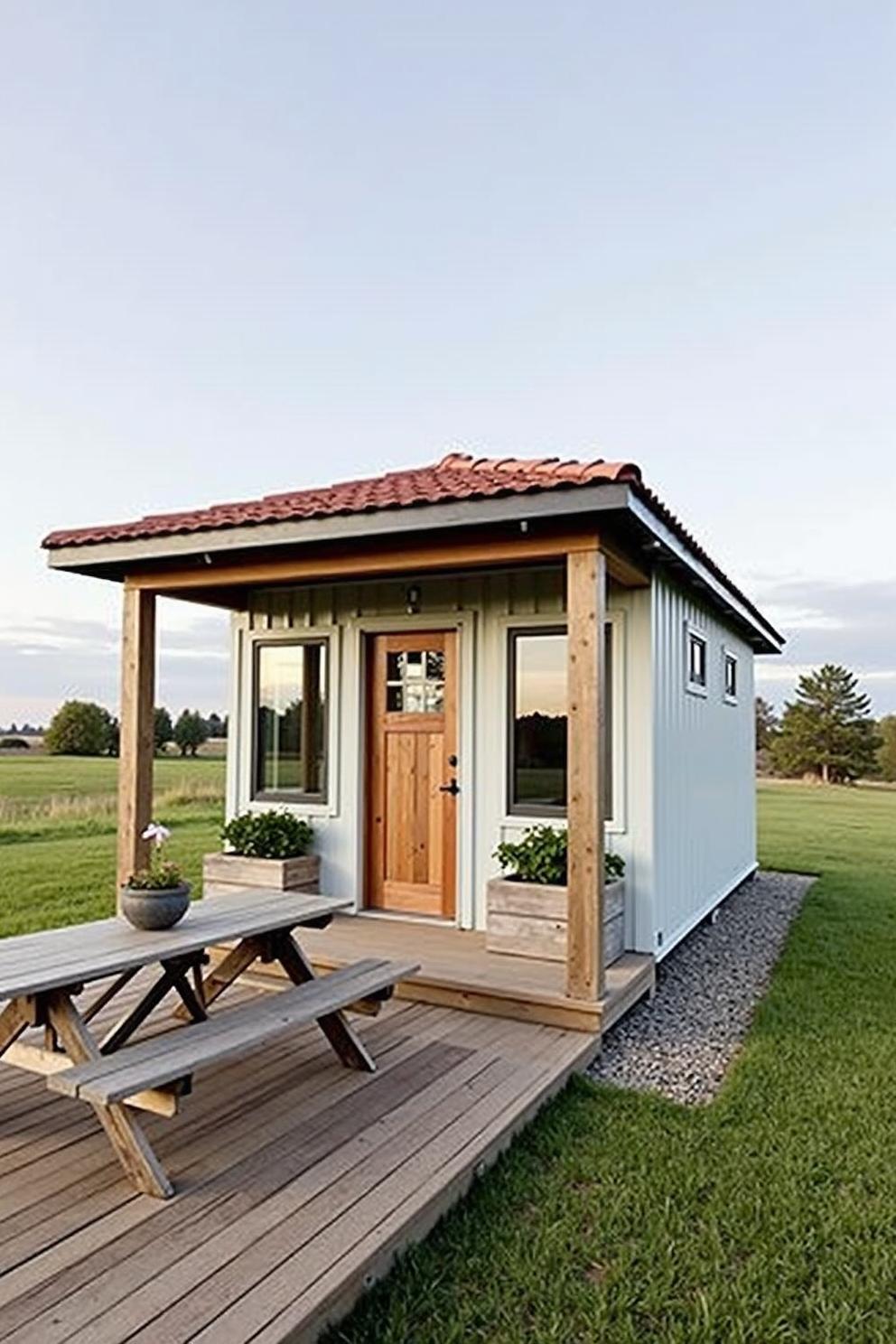 A wooden deck extends invitingly from the front, perfect for contemplating life or watching squirrels perform acrobatics. This tiny titan blends simplicity with sophistication, proving that less can indeed be more, especially with such a stylish twist.