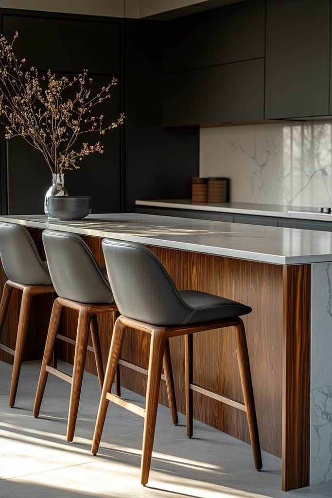 Encircling this wooden kitchen island with a marble countertop are gray leather bar stools, which offer both comfort and style.