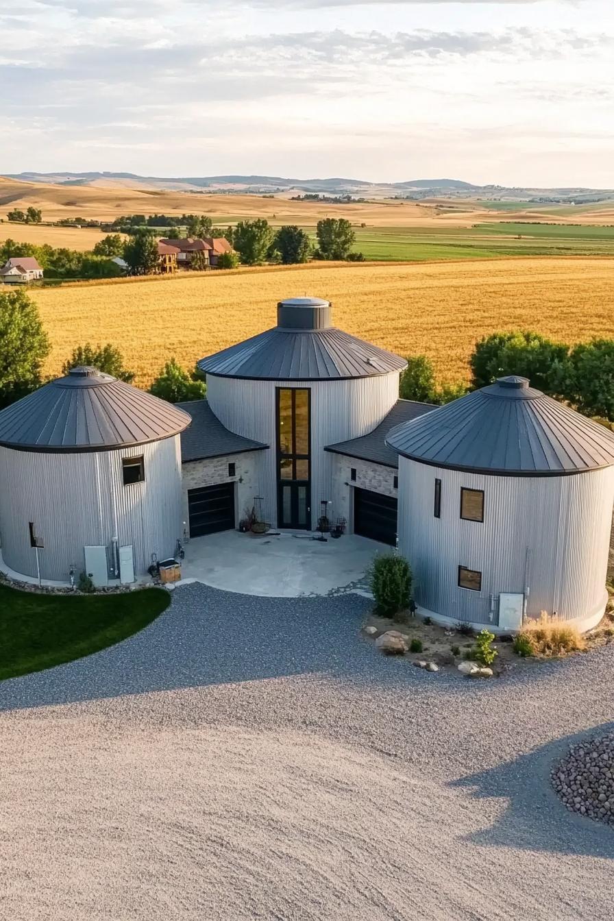 Behold the architectural marvel that’s more round than a circus tent! This quirky abode features three grand silo structures, connected through modernly styled sections that scream (or maybe politely suggest) innovation.