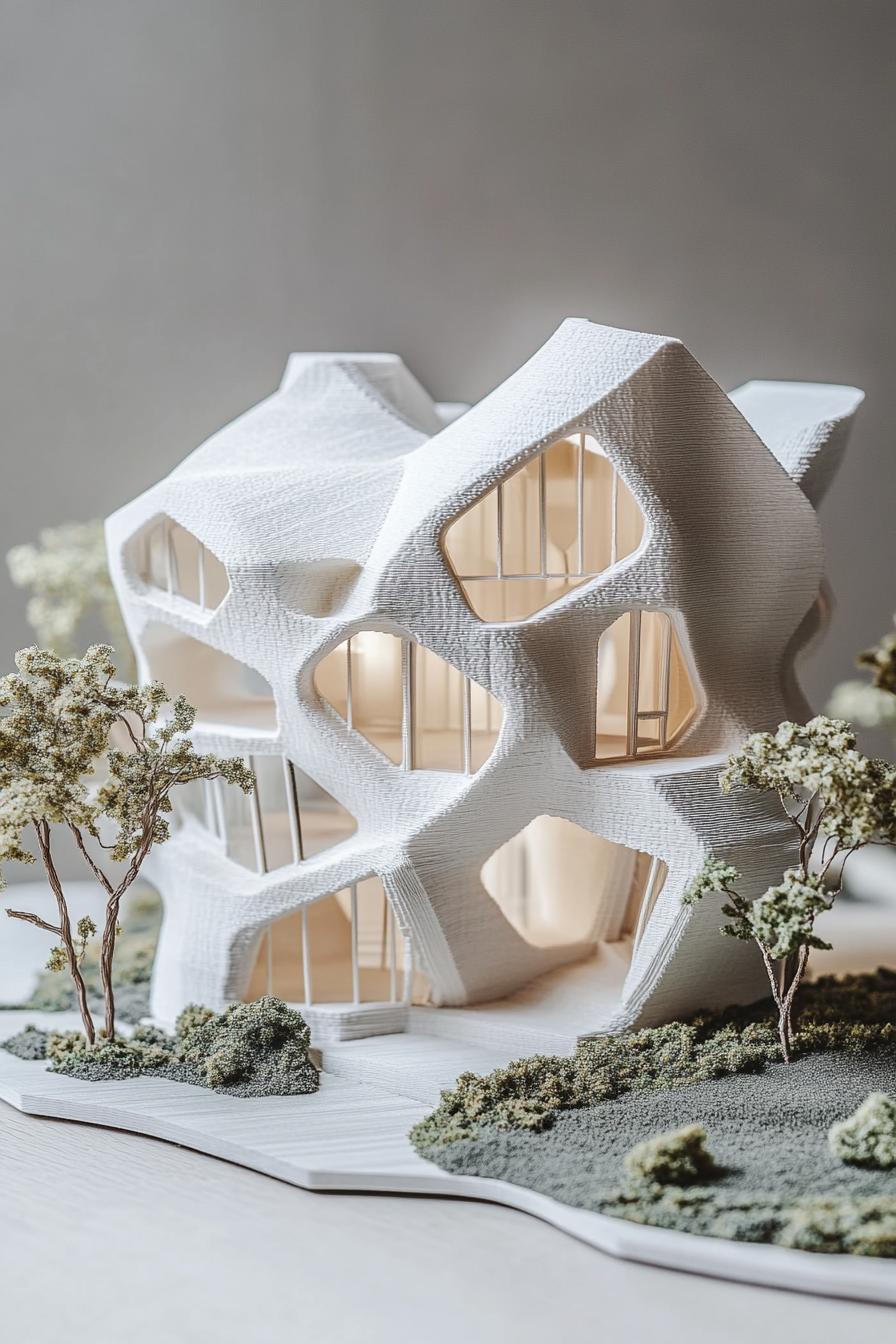 The surrounding miniature trees add a touch of realism, making it seem like the perfect spot for a tiny urban picnic. Modern, minimalist, and marvelously meticulous, this building model screams “I belong in a futuristic cityscape!”