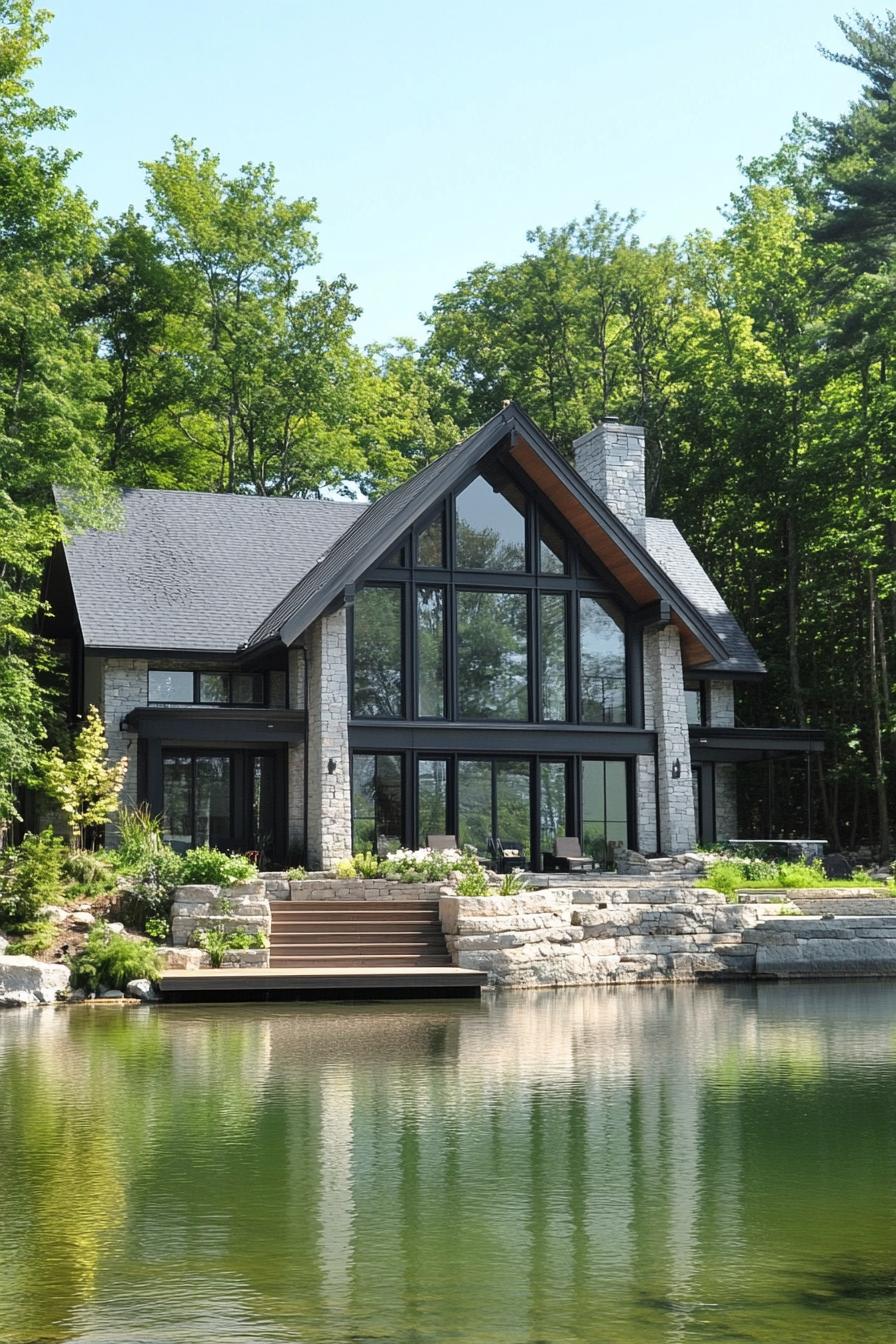 This delightful lakefront home merges modern design with rustic charm, featuring sleek black frames and warm wooden panels that make it pop against the lush greenery. Perched oh-so-confidently on sturdy stone steps, the house boasts expansive glass windows that practically beg the inside to come out and play.