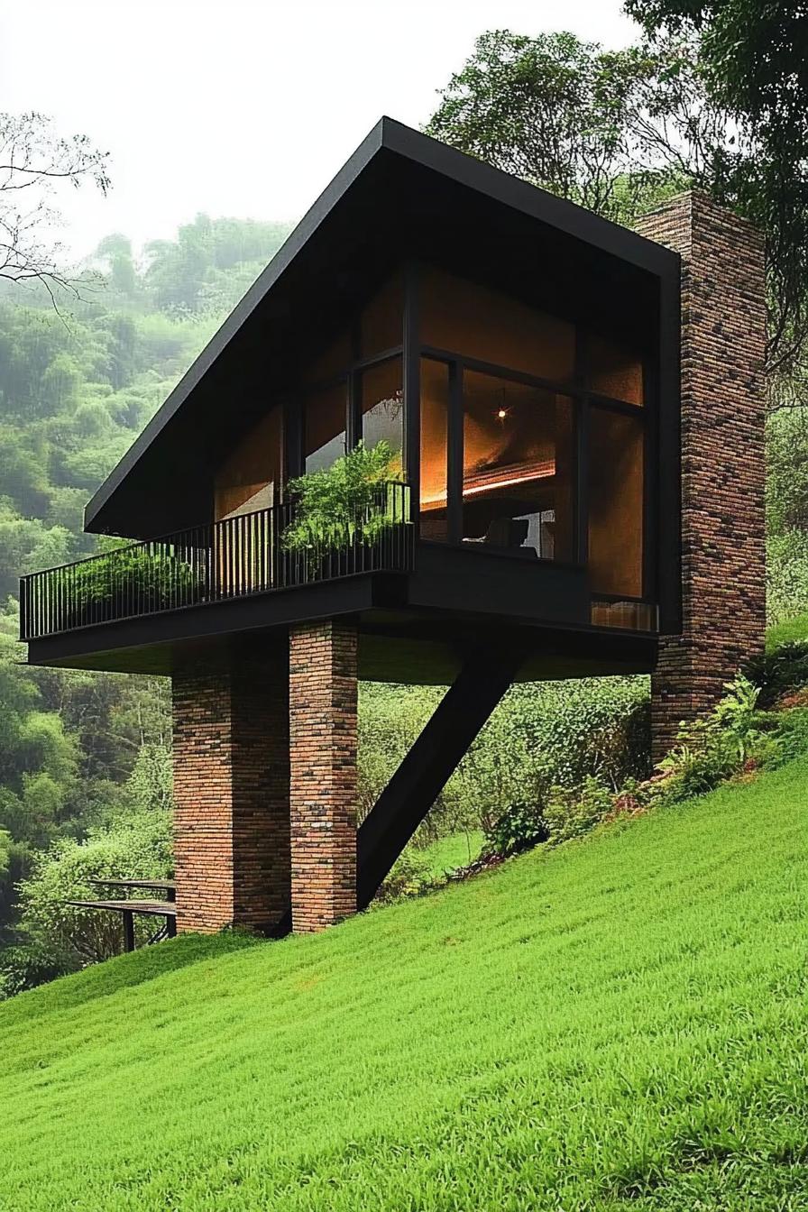Perched boldly on a lush green slope, this modern marvel flaunts its angular roof like a hat tilted just so. With floor-to-ceiling windows and a cozy outdoor patio perched atop sturdy support beams, it’s got the charm of a treehouse minus the rickety ladders.