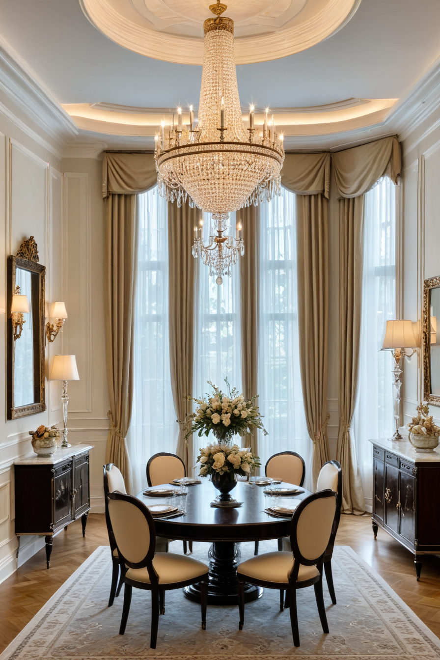A neoclassical dining room is the definition of grace and it consists of a long wood dining table with warmly upholstered chairs. Chandeliers or pendant lights provide soft lighting, while framed artwork or mirrors adorn the walls.