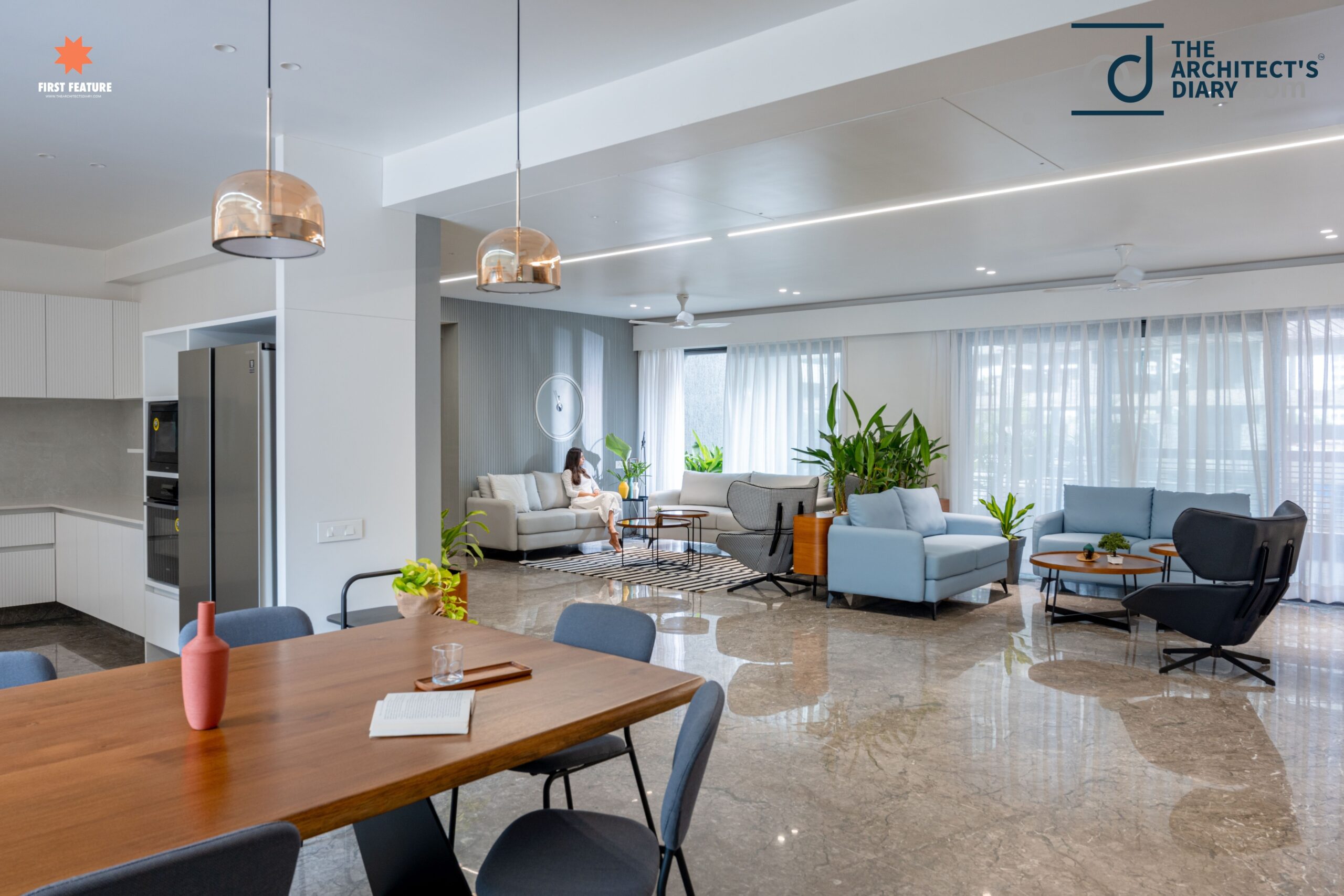 A signature touch by The Crossboundaries, a sculpture representing intense verticality with a stunning split in its body sits gracefully in the corner of the living area. Complementing this artwork, elements like the backlit TV unit appear to be floating, giving a sense of lightness to the space. A pair of linear profile LED lights run across the ceiling, creating a sense of extended linearity and depth. Clusters of indoor plants, alive in their freshness against long windows, are peppered across the living area, creating picture-worthy frames! The sense of lightness and airiness traverses into the open-plan dining and kitchen area, in essential whites and demure greys. The dining area is displayed as a flexible family space, with a clutter-free layout and clean finishes such as the polished wooden dining table-top.