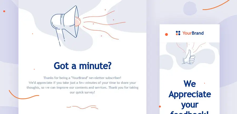Designing survey invitation emails is no easy feat! Optimize your return on investment by getting readers to participate. If you need a little help getting started, check out our kit of survey email templates by designer Matteo Della Chiesa. The set includes five emails to take you from start to finish: