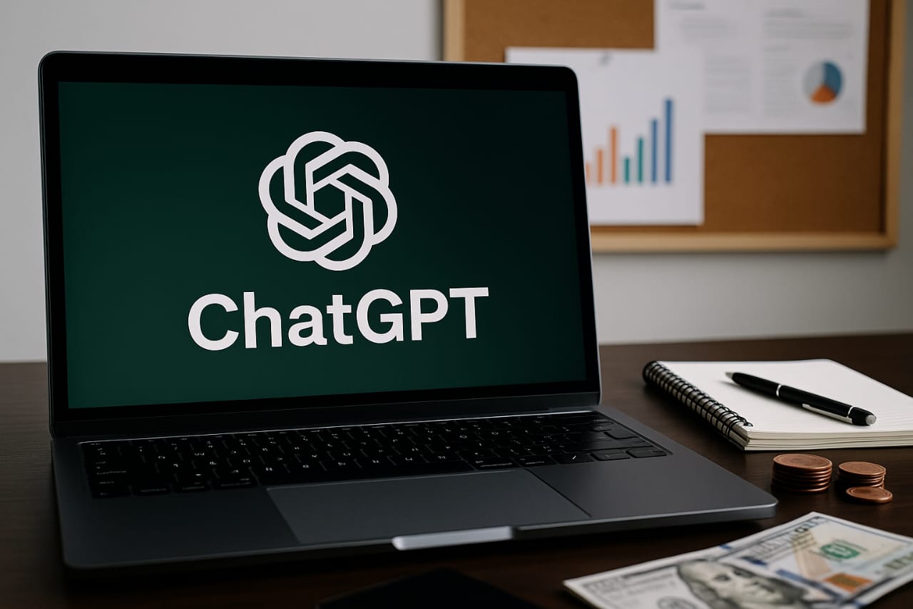 A laptop displaying the ChatGPT logo on its screen sits on a desk with financial elements like dollar bills, coins, a spiral notebook, and a pen, with a blurred corkboard featuring colorful charts in the background.