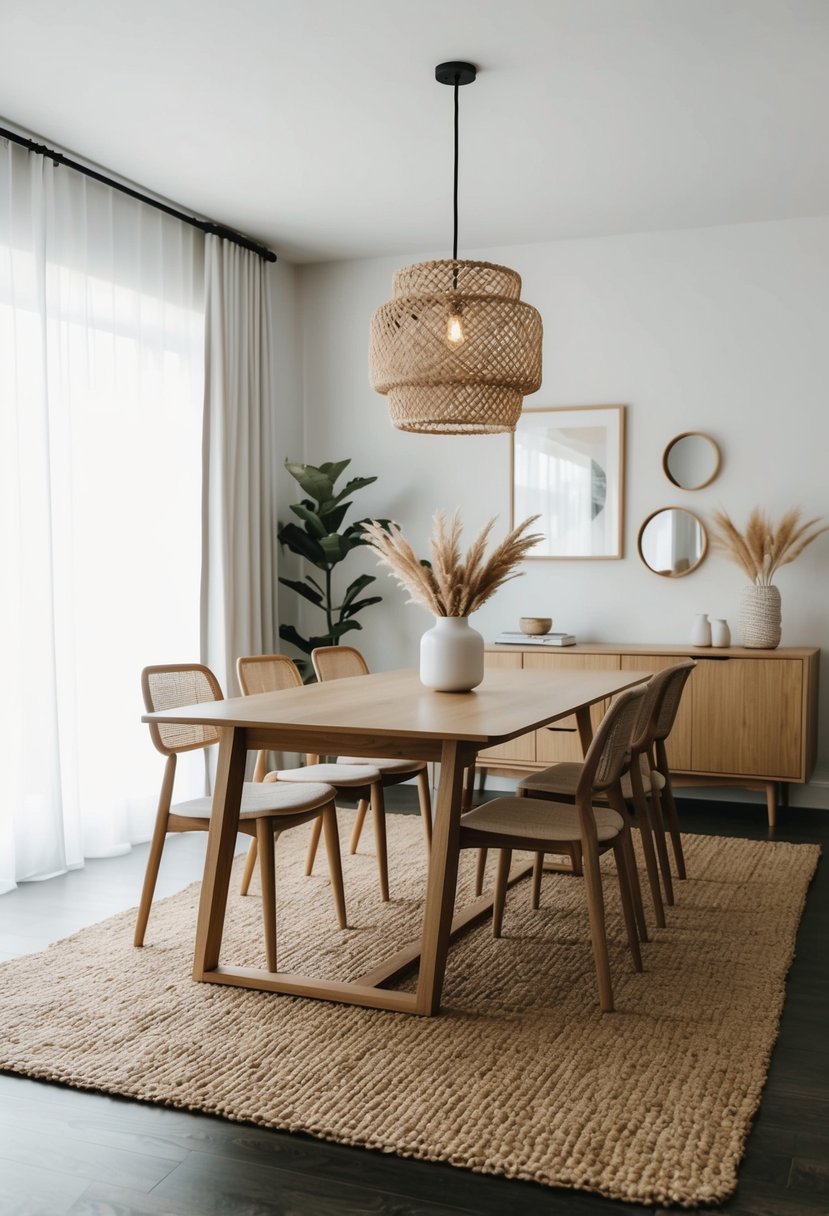Adding a jute rug to your dining room can enhance your decor. It works well with wood and light colors. This choice helps tie together your Japandi design theme beautifully.