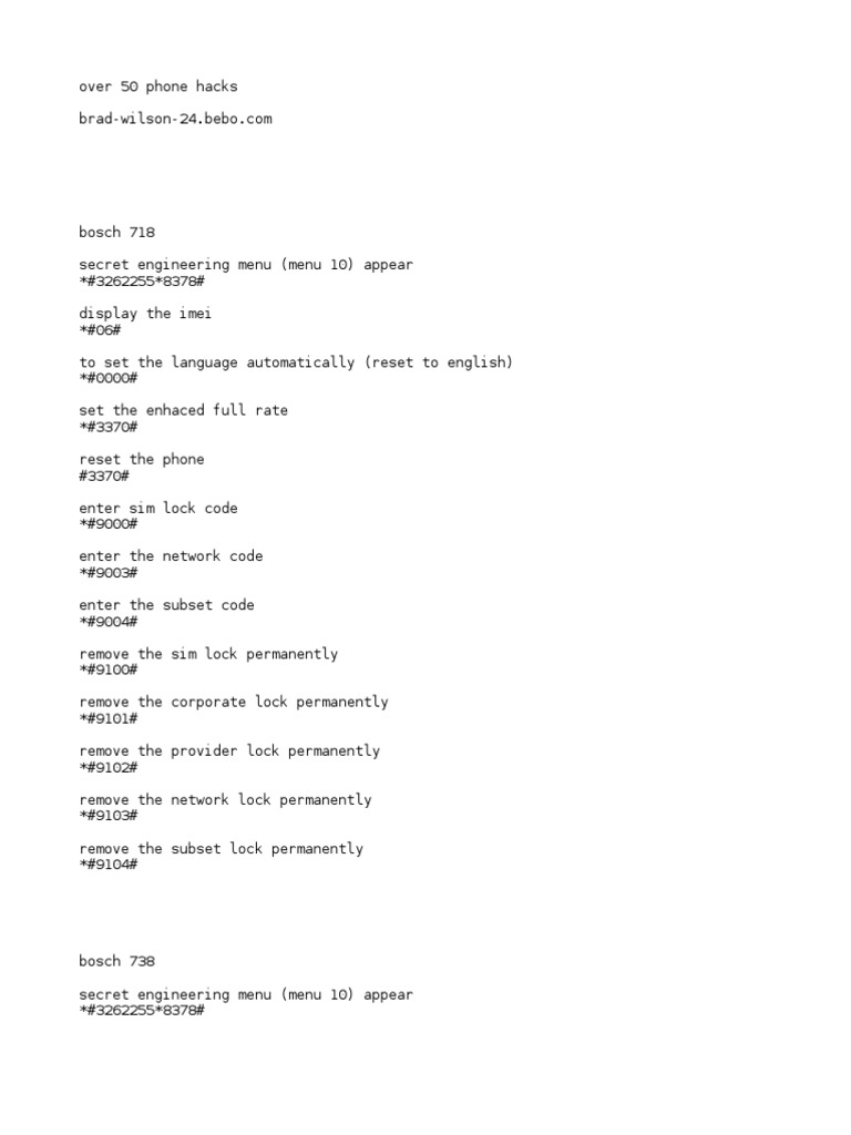 This document provides code sequences or “secrets” to access hidden menus and features on various mobile phone models, including Bosch, Ericsson, Motorola, and Nokia phones. Some of the codes allow users to view or modify settings like the IMEI number, software version, language settings, and to permanently remove locks. Other codes provide diagnostic information about the phone’s network or base station connection.