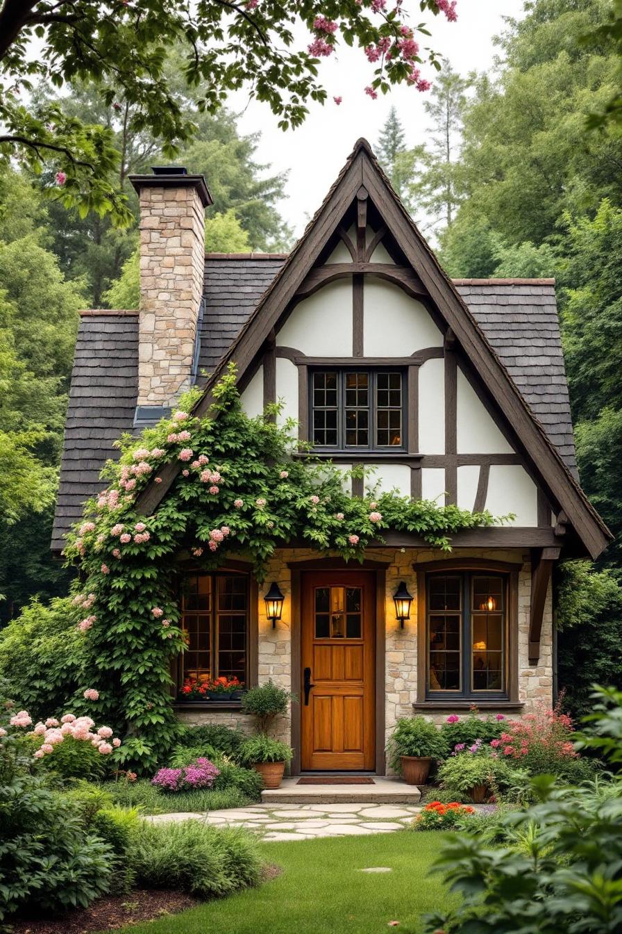 This adorable abode flaunts its rustic charm with timber beams and a cozy stone chimney that would make any fairy tale character green with envy. Climbing vines and vibrant blooms playfully compete for attention on the charming façade.