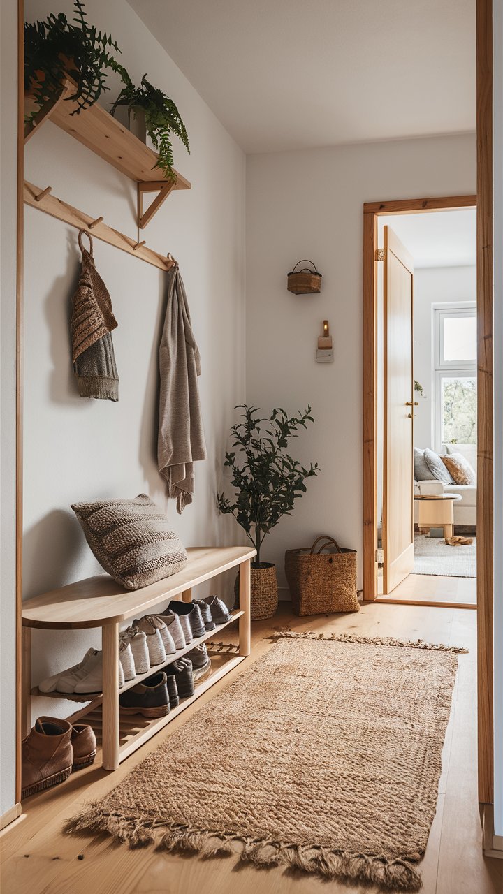 A simple wooden bench paired with a low-profile shoe rack and a soft jute rug creates an inviting, zen-like space. The key is to keep it minimal yet cozy, with a focus on natural materials and soft lighting.