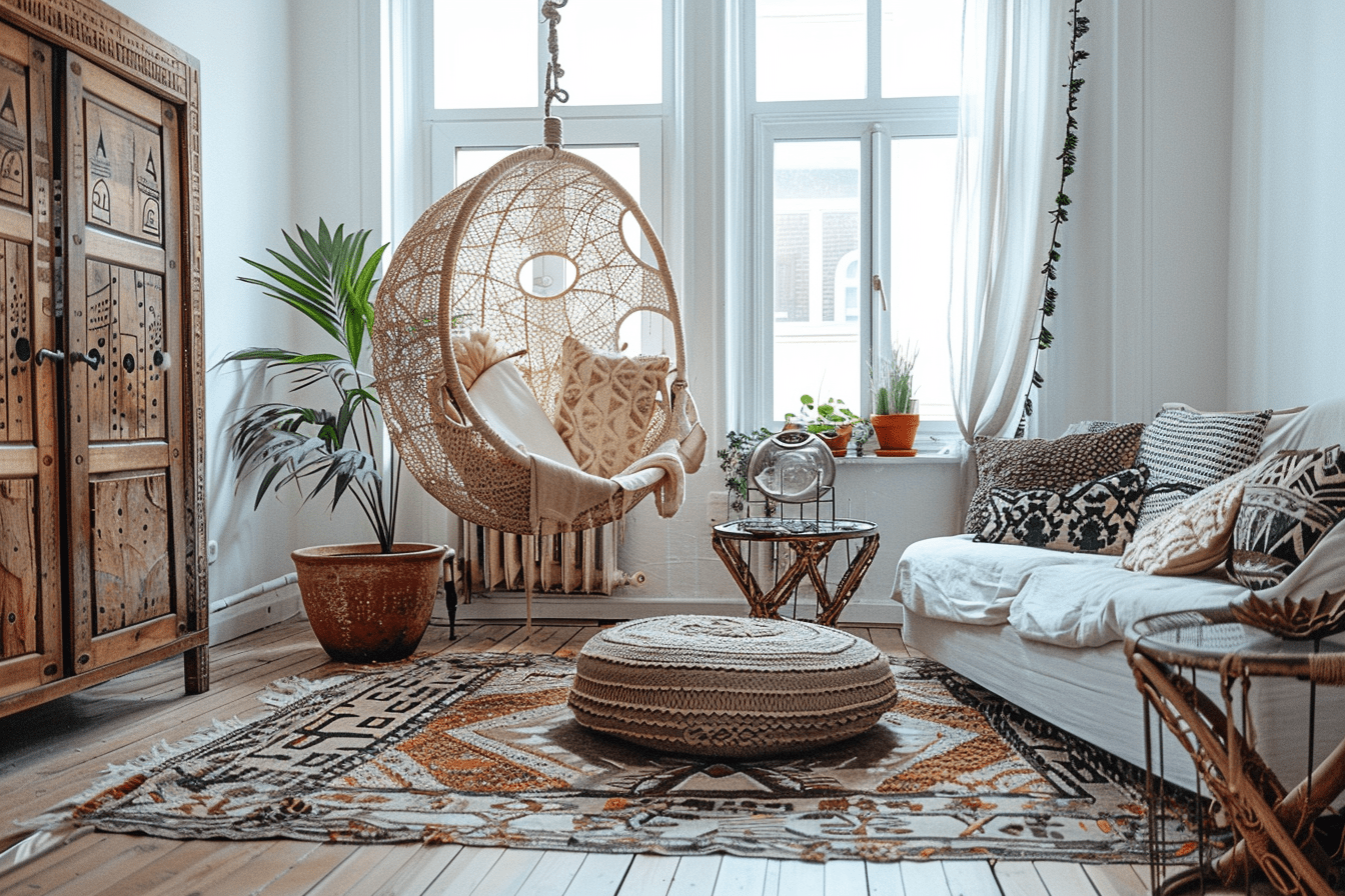 A boho living room with a macramé swing, textured pillows, and a kilim rug offers a playful and relaxed vibe. The swing and rich textiles add comfort and whimsy to the space.