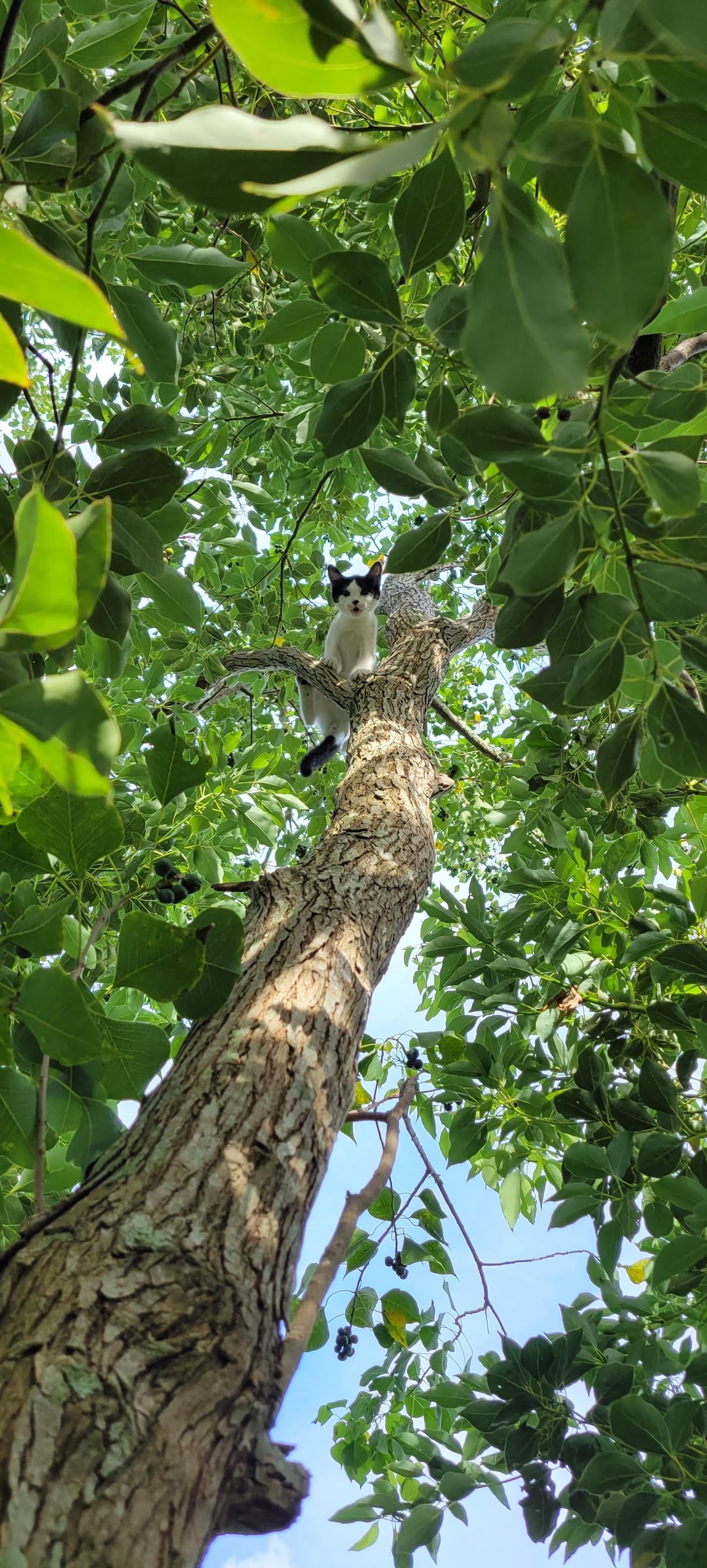60ft up in a tree, my kitten PimpSea got himself stuck. I used a 30ft extension ladder and climbed up as high as I could, he was still unreachable. So I held up a 10ft gutter for him to jump in to. Roughly 8 hours of shouting “PimpSea come down” he jumped and slide right to me! Carried him down safe