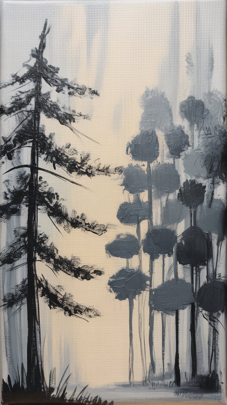 Mix a medium gray (black + white) and fill in background trees with loose, vertical brushstrokes. Let some brush marks show.