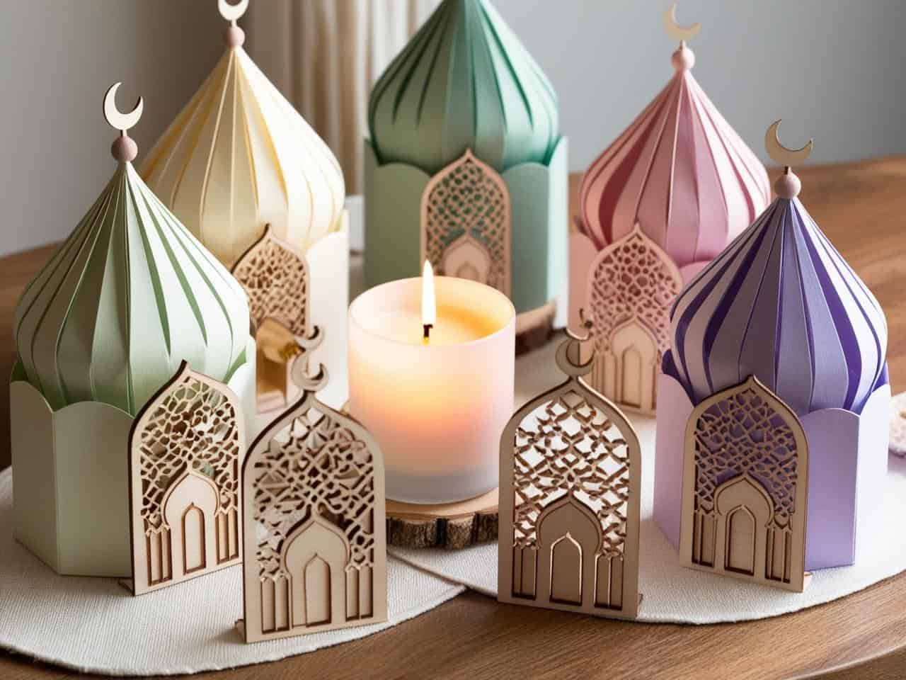 These handcrafted mosque decorations combine intricate laser-cut wood with pastel paper domes for a modern yet traditional look. Perfect for a Ramadan table setting or as an Eid decoration, they bring an artistic touch to any festive space. Get creative with your colors and make a stunning display.These handcrafted mosque decorations combine intricate laser-cut wood with pastel paper domes for a modern yet traditional look. Perfect for a Ramadan table setting or as an Eid decoration, they bring an artistic touch to any festive space. Get creative with your colors and make a stunning display.