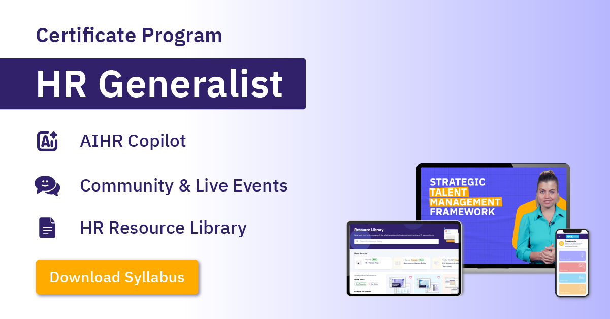 In AIHR’s HR Generalist Certificate Program, you’ll build a comprehensive skill set to handle HR’s diverse responsibilities. Learn to apply best practices across all seven HR basics, align people strategies with organizational goals, and foster a productive, engaged workforce.