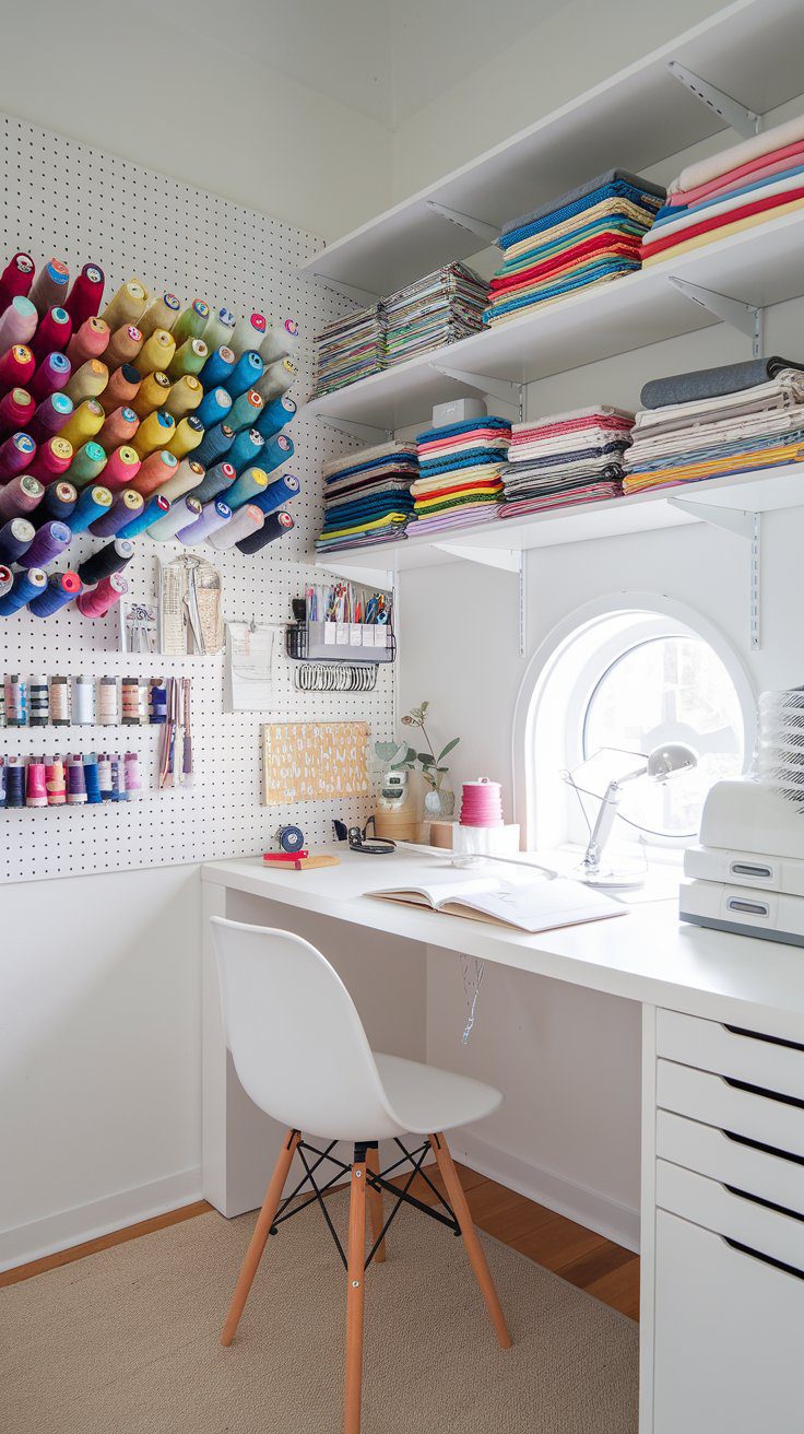 Picture this: A light-filled corner with everything in its place. Colorful spools of thread line a pegboard like a rainbow, while stacks of folded fabric sit neatly on white shelves. A sleek white desk with plenty of workspace invites you to dive into your next project.