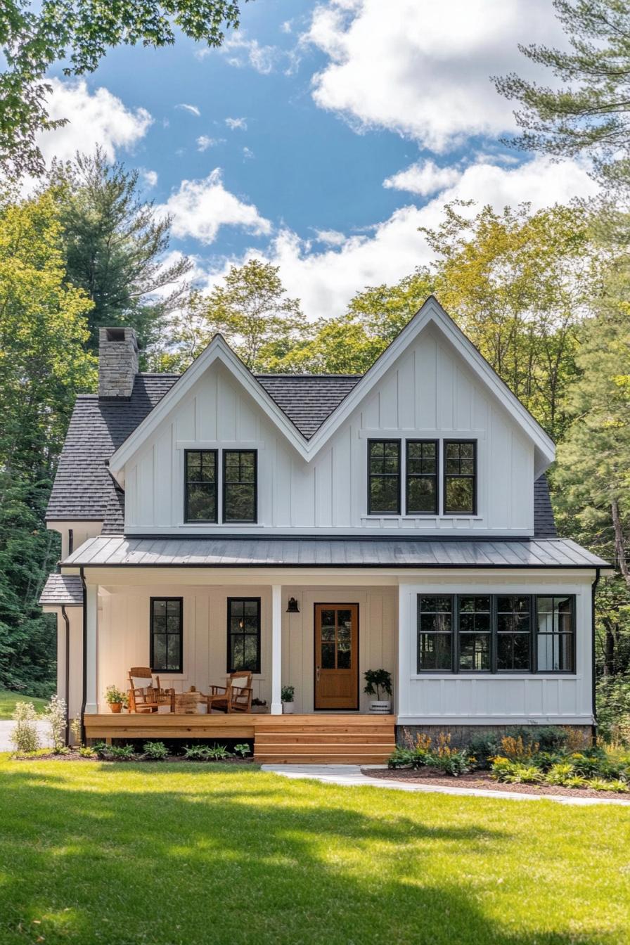 Behold the house with a sleek, dark gabled roof that meets a crisp, white facade. Its front porch beckons with warm wooden accents and welcoming chairs, making it the perfect spot for lemonade sipping.
