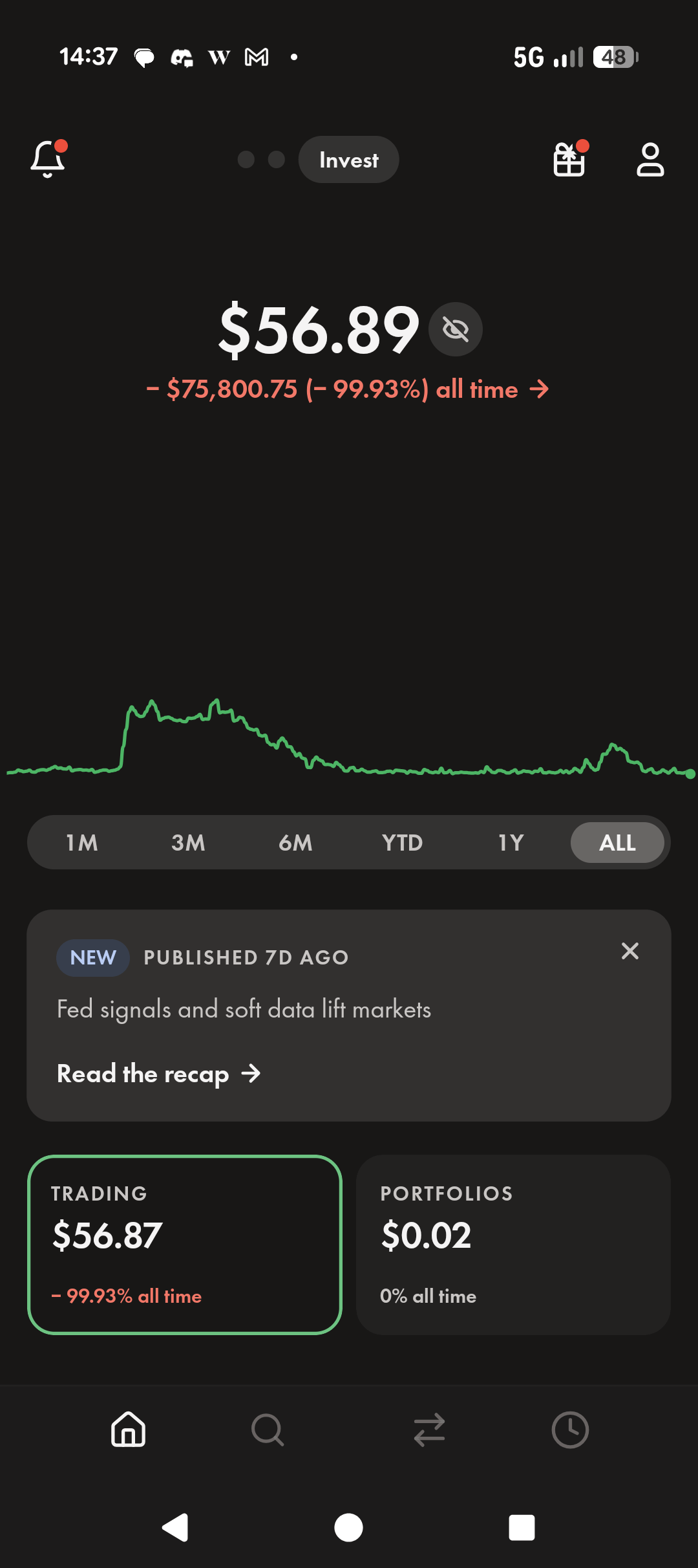 Some days I'm really good at trading. Ranges are easy to decipher, momentum is easy to read…but more days I'm terrible. I'll catch back up on my bills by February, but it's gonna be a lean Christmas. This is my final act of contrition for my poor finances, the WSB loss porn. Looks like I'm a "just buy XEQT" guy now.