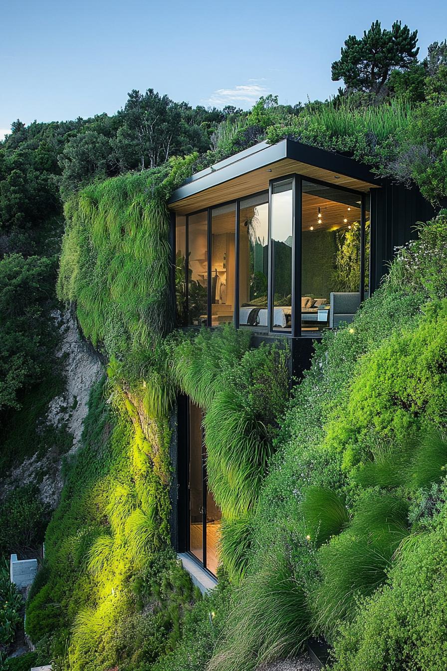 Nestled on a vibrant hillside, this eco-friendly dwelling is a seamless blend of nature and innovation. Its green roof bursts with life, practically auditioning for a role in “Return of the Jungle.” Expansive glass walls flaunt uninterrupted views, while the sleek black frame creates a striking contrast against the lush surroundings.