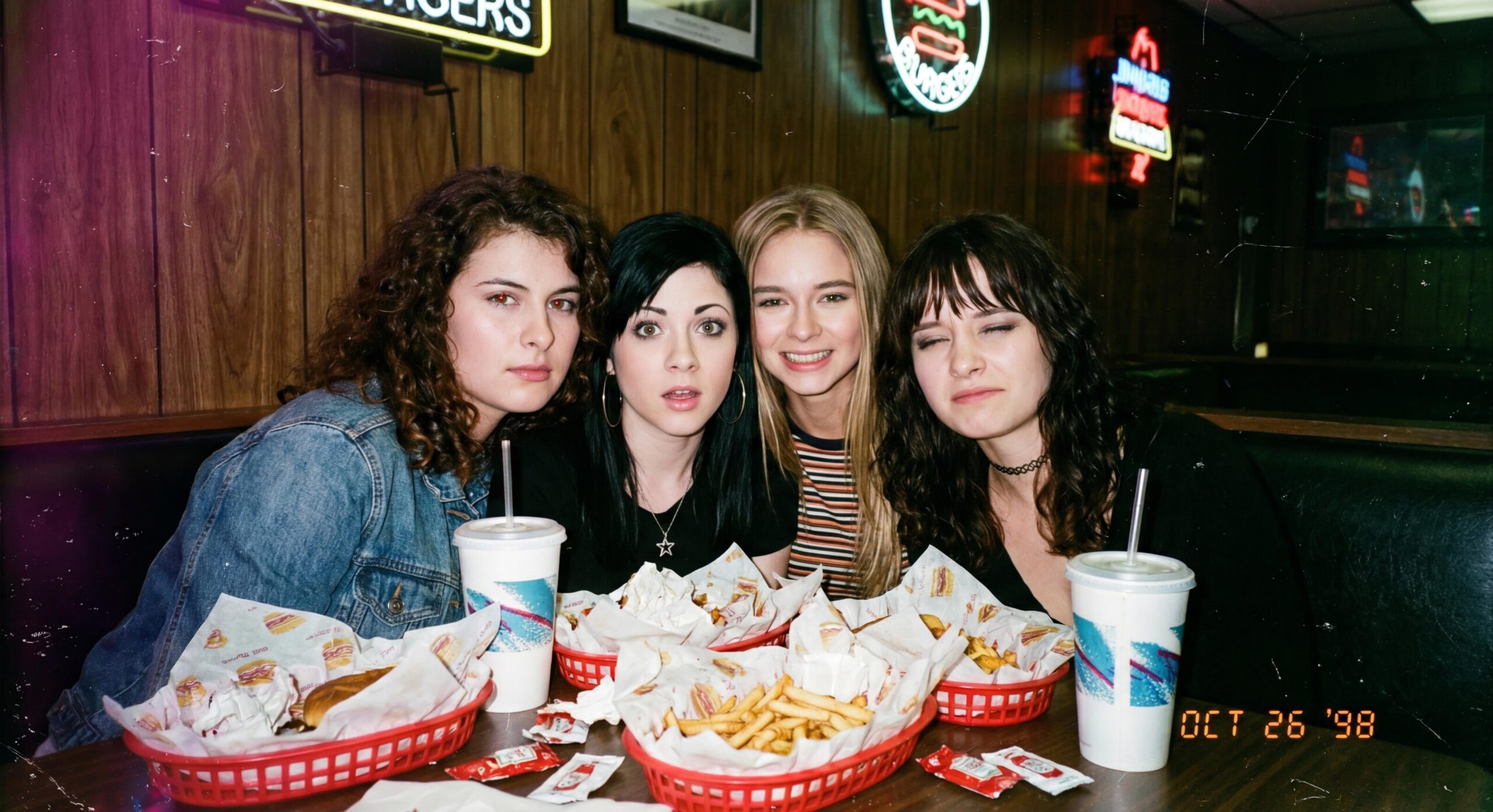 [Scene] Interior of a burger joint (1990's aesthetics). Characters are crowded into a booth. The table is cluttered with burger wrappers, fries in red baskets, and soda cups of the time. 90's Fashion, Hairstyles and glasses.