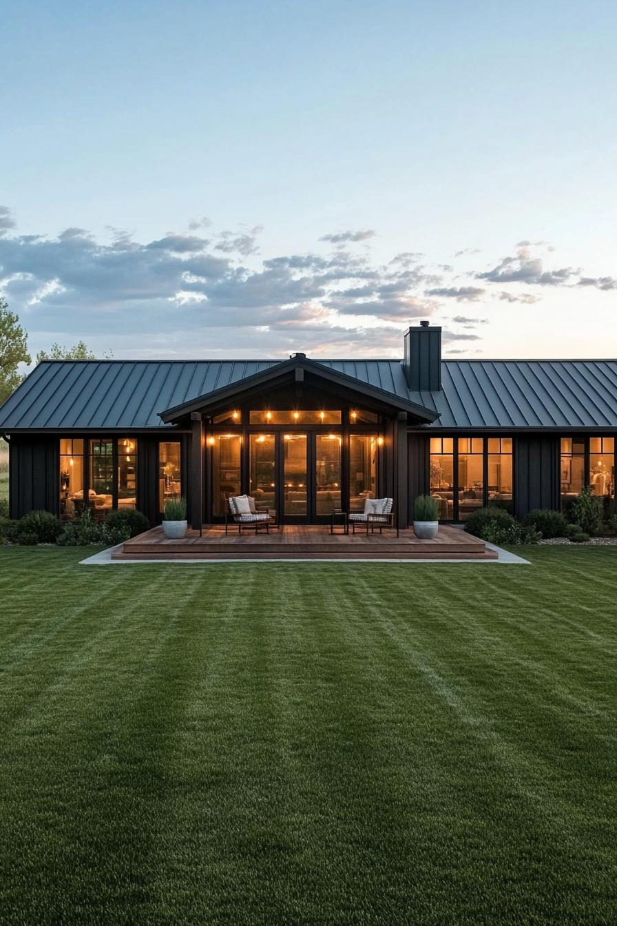 This ranch house is a delightful blend of modern flair and classic charm, set against a dramatic sunset sky. With its sleek black-framed windows and pristine white facade, it provides a crisp contrast to the lush green lawn. The gabled roof adds a touch of traditional style, but don’t be fooled—this house is all about the modern comforts.