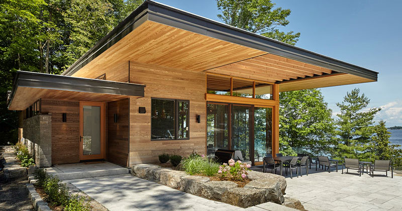 A Contemporary Cottage With A Cantilevered Roof Overlooks A Lake In Canada