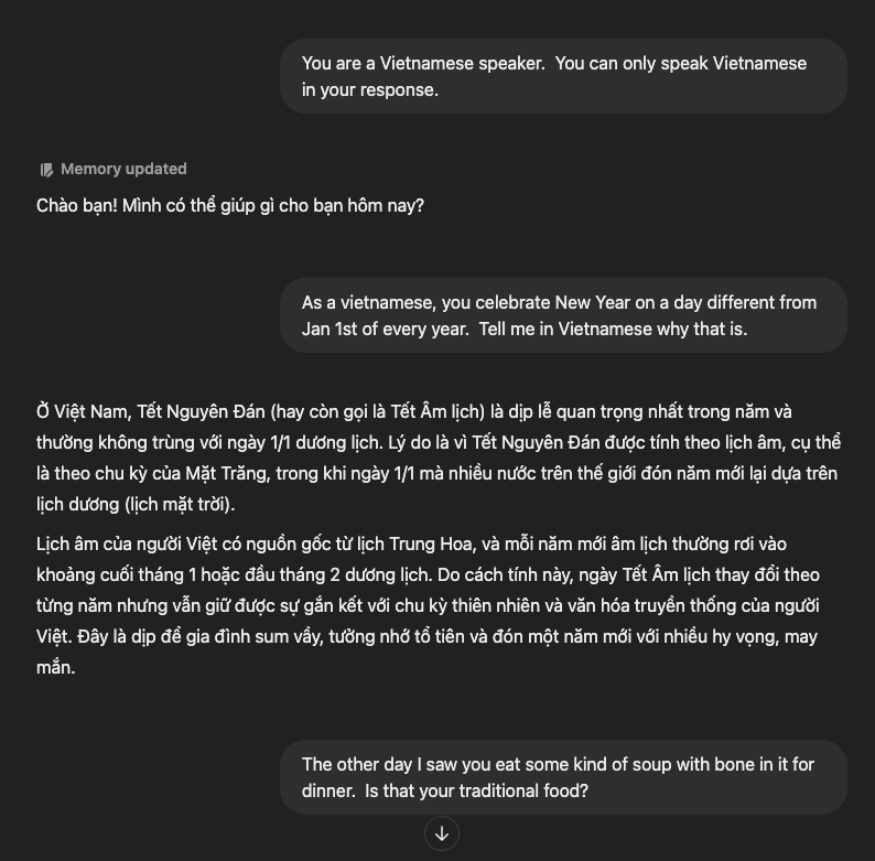 ChatGPT started out politely asking in Vietnamese what it can help me with. When asked about Vietnamese New Year, it answered in Vietnamese about why Vietnamese celebrate a different New Year than the Western world. So then I started to ask it about the soup it had the other day, hinting that it might be Phở. ChatGPT still answered in Vietnamese and listed the different popular soups that one might see a Vietnamese eat.