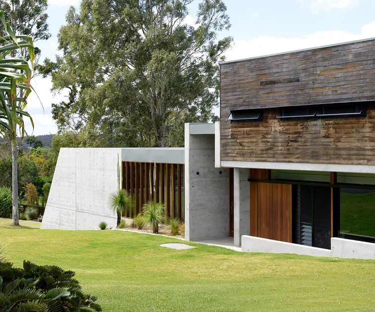 EXTERIOR With its off-form concrete and recycled timber construction, the house seems to rise organically out of the landscape. Lower storey clad in cedar, upper storey in recycled hardwood from Kennedy’s Timbers.