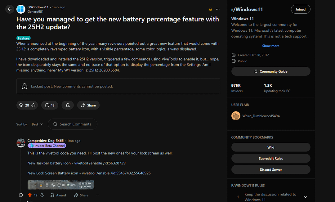 I just want to thank you for your help! I was wanting to reply and thank you in the original posting that I captured in the photos of your help, but new posts and replies are no longer accepted. I was researching on the battery icon and percentage for awhile and got the start menu and dark mode enabled, but never did find the right id # until I found your id. I tried your id numbers and restarted and new battery appeared. God bless you both!