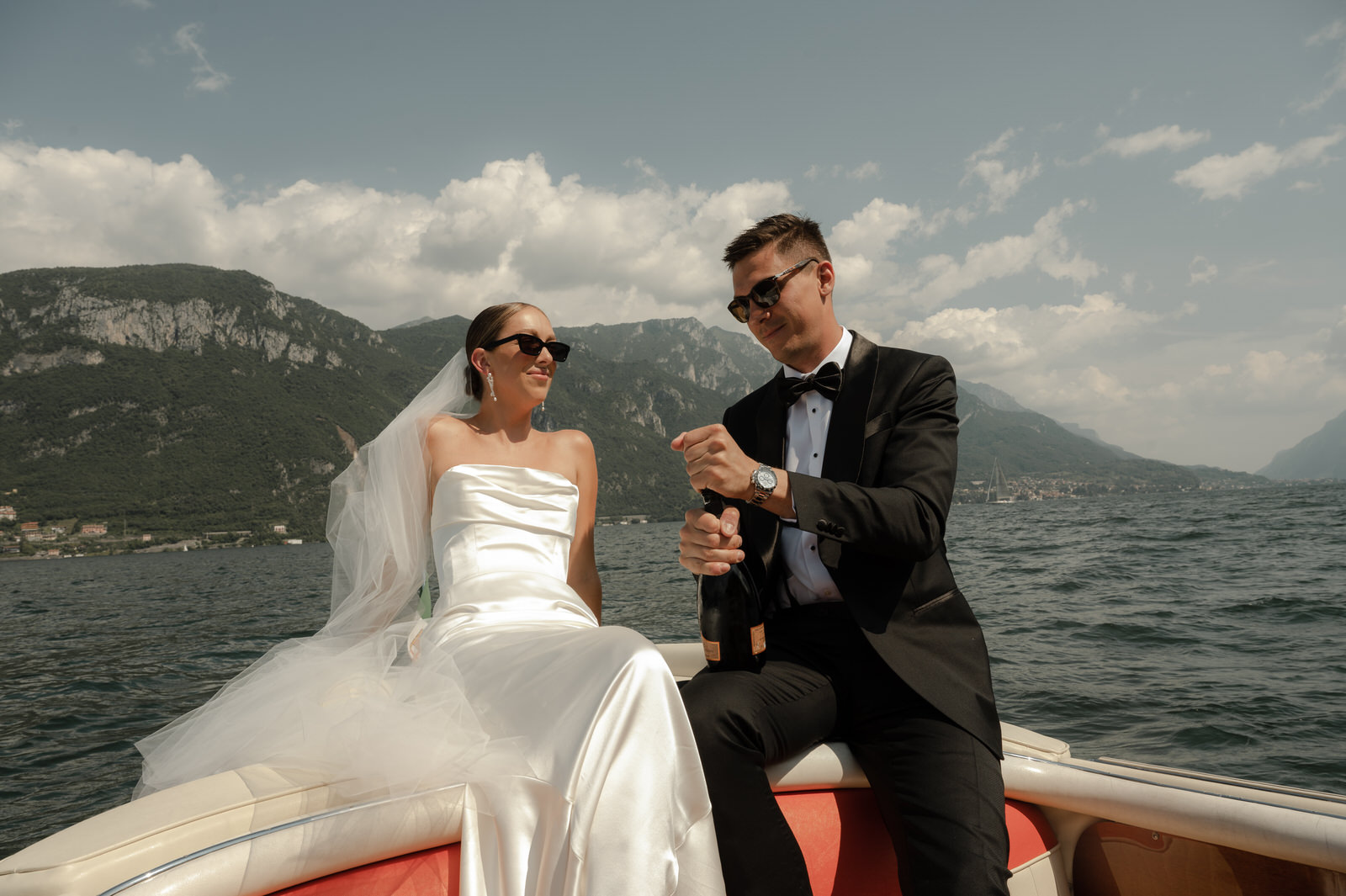 As guests traveled to the ceremony space via a scenic cocktail cruise, the pair boarded their own mahogany vessel and popped Champagne—a toast to the two of them. In the ceremony space, hand-painted paper fans detailed each seat and white florals, by Il Profumo Dei Fiori, added to the lakeside wonderland.